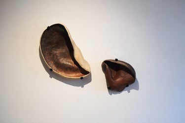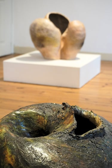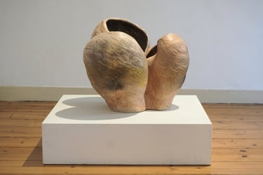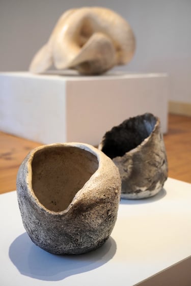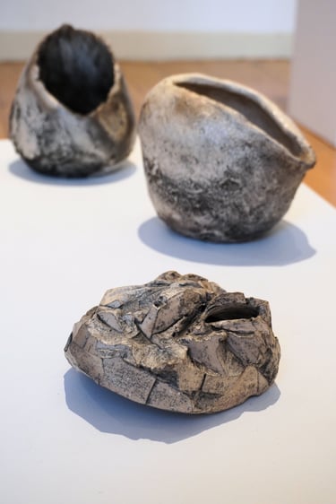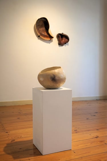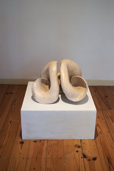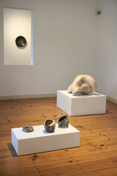 The Dream of Inhabiting the Shell brings together a set of ceramic sculptures, which are the result of exploring the theme of shelter as a symbolic image. Inspired by Gaston Bachelard's work The Poetics of Space, the title evokes the shell as a primitive archetype of the home—an expression of the intimate need for retreat and shelter that welcomes dreams. The symbolic shell runs through the entire creative process. The spiral movement that gives rise to it reappears in the modeling of the clay: a spiral that turns in on itself, but at the same time grows and transforms, a universal symbol of origin. The modeling is done through an intuitive gesture, similar to that of an animal building its “home.” And, just as the mollusk slowly builds its dwelling, these imagined shelters also emerge from a continuous process, in which the form is revealed gradually, shrouded in mystery. There is also an essential contradiction: the animal's soft and fragile body is capable of creating a structure as hard and resistant as a stone. Similarly, the clay, initially malleable, molded by direct contact with the skin and muscles, hardens until it becomes solid. From this tactile and very intimate experience, the lasting walls of these shelters emerge. The shell thus becomes a metaphor for shelter and protection, a secret place where the inner self finds the security to exist. Each piece is born from the desire for a safe space to dream. Each imagined shell is an emotional shelter and, at the same time, an incubator for the dream that gives rise to it.